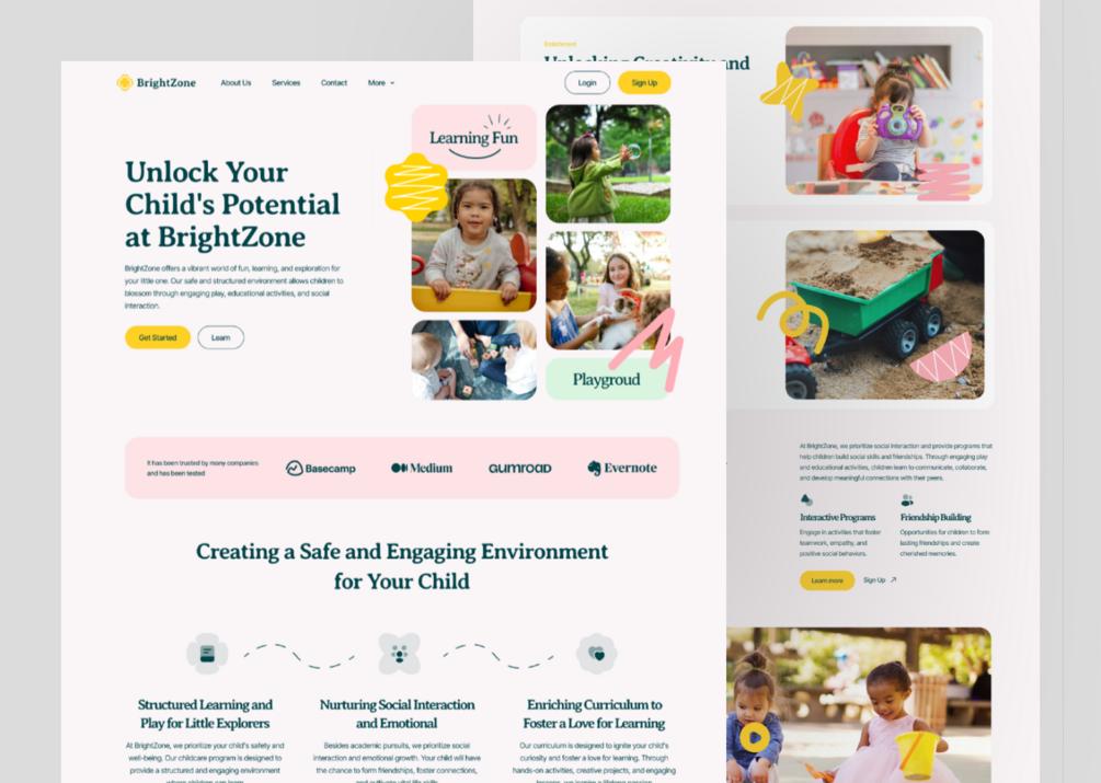 Brightzone offers a vibrant world of fun, learning, and exploration for your little ones. Our safe and structured environment allows children to grow through engaging daily activities, educational adventures, and social interactions. With Brightzone landing page, you'll present your childcare center's offerings in a visually appealing and professional manner.